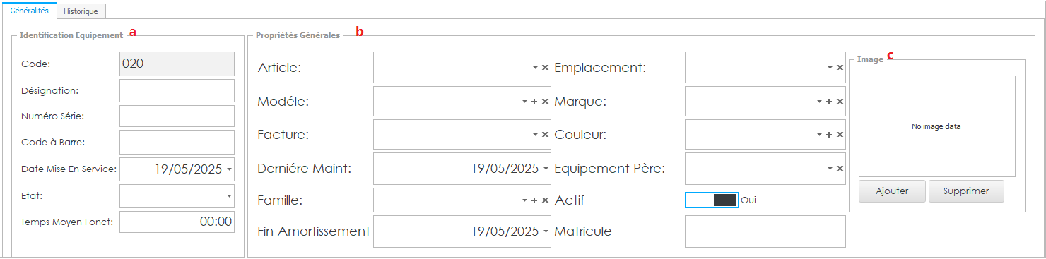 L’onglet Général d’une fiche équipement se compose de trois sections principales :