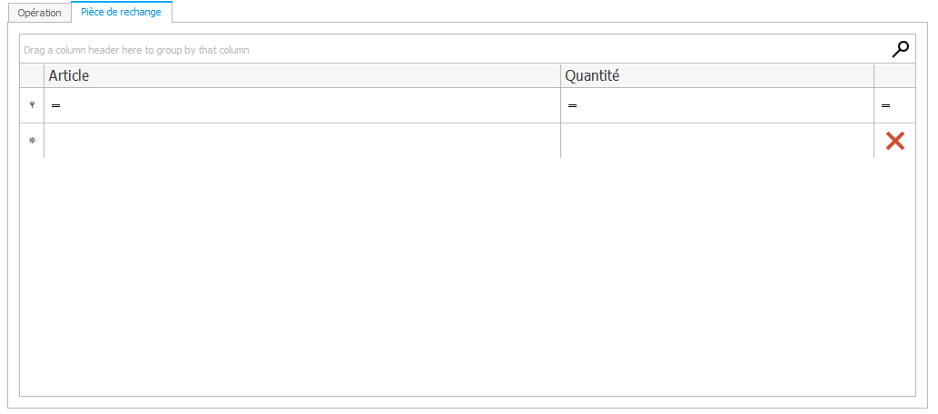 Colonne Opération : liste déroulante des opérations préconfigurées (ex. « Contrôle visuel », « Graissage »).