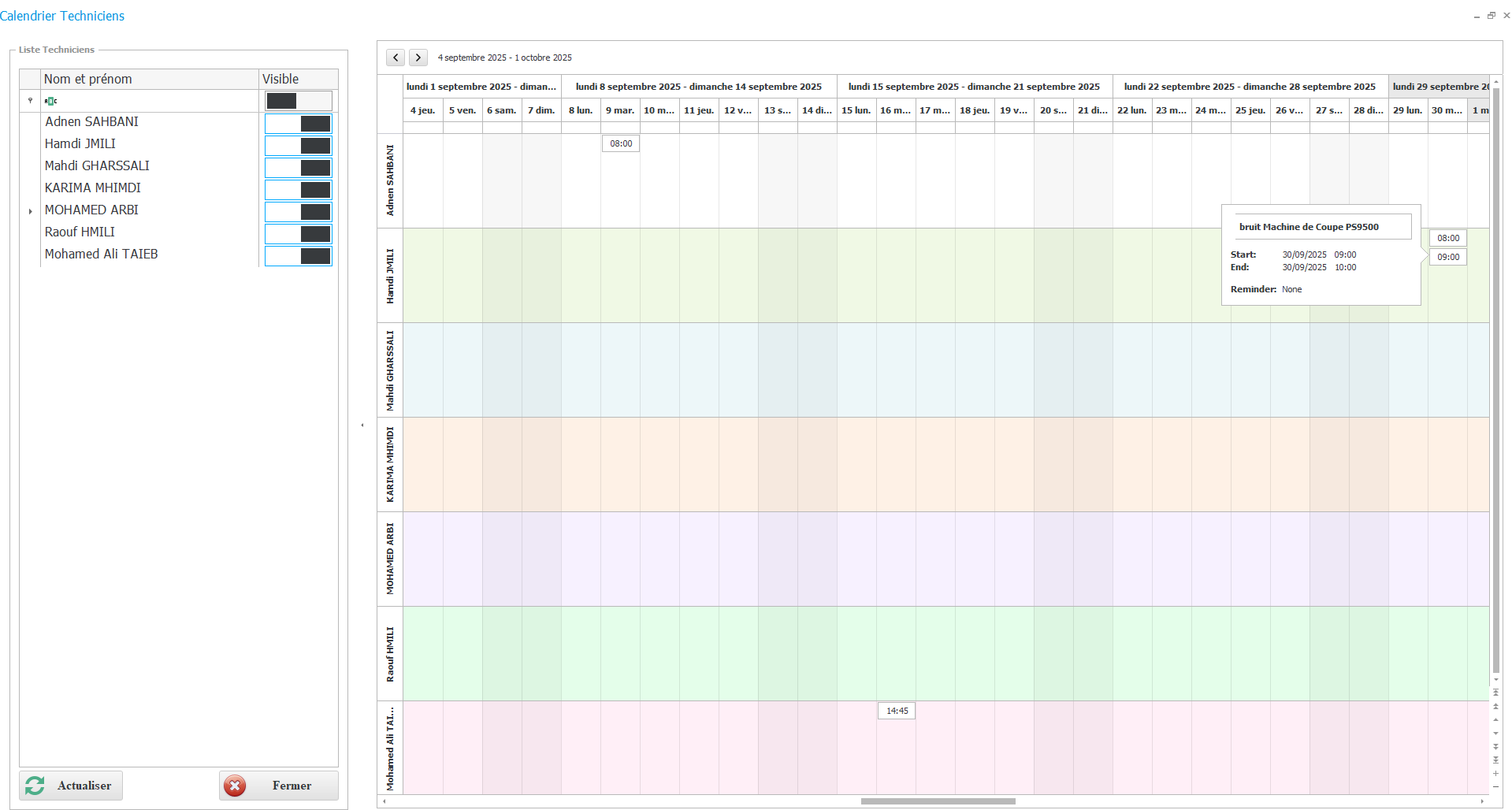 Le sous-module Occupation Technicien, intégré au module Gestion de Maintenance, permet d’afficher et de gérer l’agenda des techniciens. Il constitue un outil de planification et de suivi, garantissant une meilleure organisation des interventions de maintenance préventive et corrective.