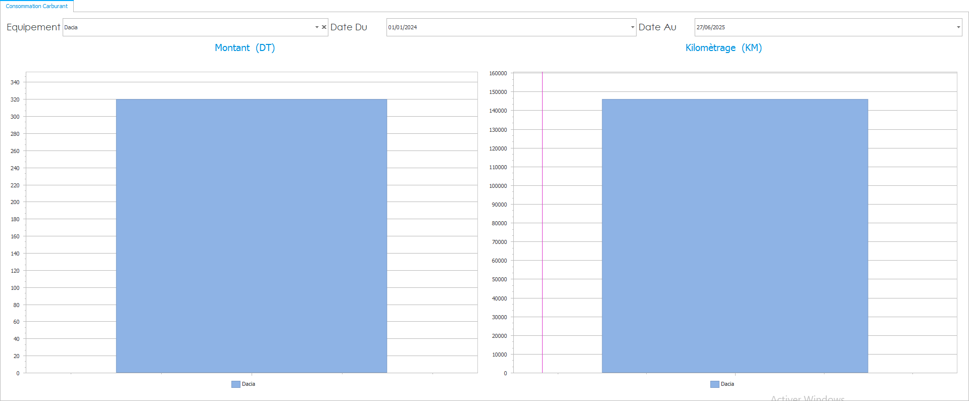 Le sous-module Consommation Carburant permet d’analyser de manière graphique et interactive la consommation en carburant d’un équipement (véhicule ou machine) sur une période donnée.