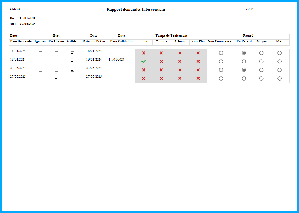 Le sous-module Suivi Demande permet de consulter l’état d’avancement des demandes d’intervention enregistrées dans DUX-GMAO, avec un suivi détaillé des différentes étapes (de la création jusqu’à la clôture), tout en évaluant les délais de traitement.