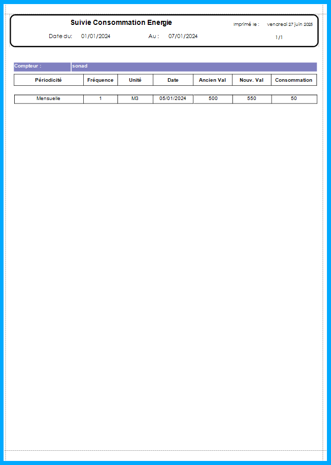 Une fois les dates sélectionnées et validées, l’utilisateur accède à l’interface « Suivi consommation énergie », qui présente de manière structurée les relevés des compteurs pour les équipements suivis.