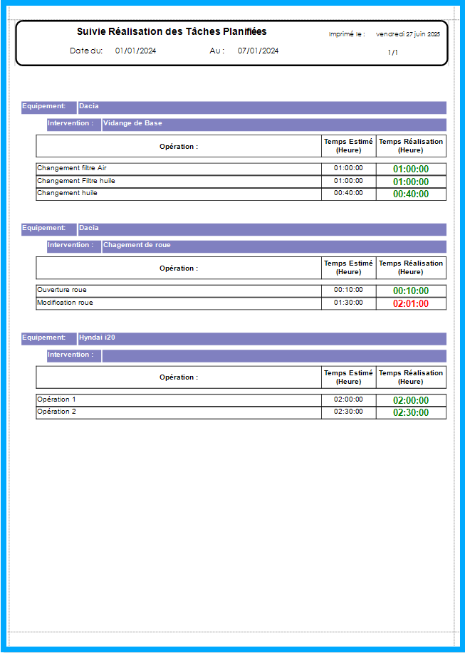 Une fois les critères validés, une interface synthétique et structurée s’affiche, répertoriant les opérations planifiées et réalisées pour chaque équipement, dans la période définie.