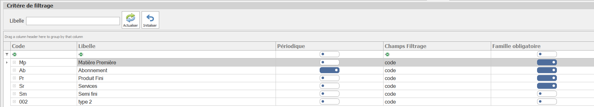 Cette interface nous permet de visualiser tous les types d’articles déjà paramétrés
