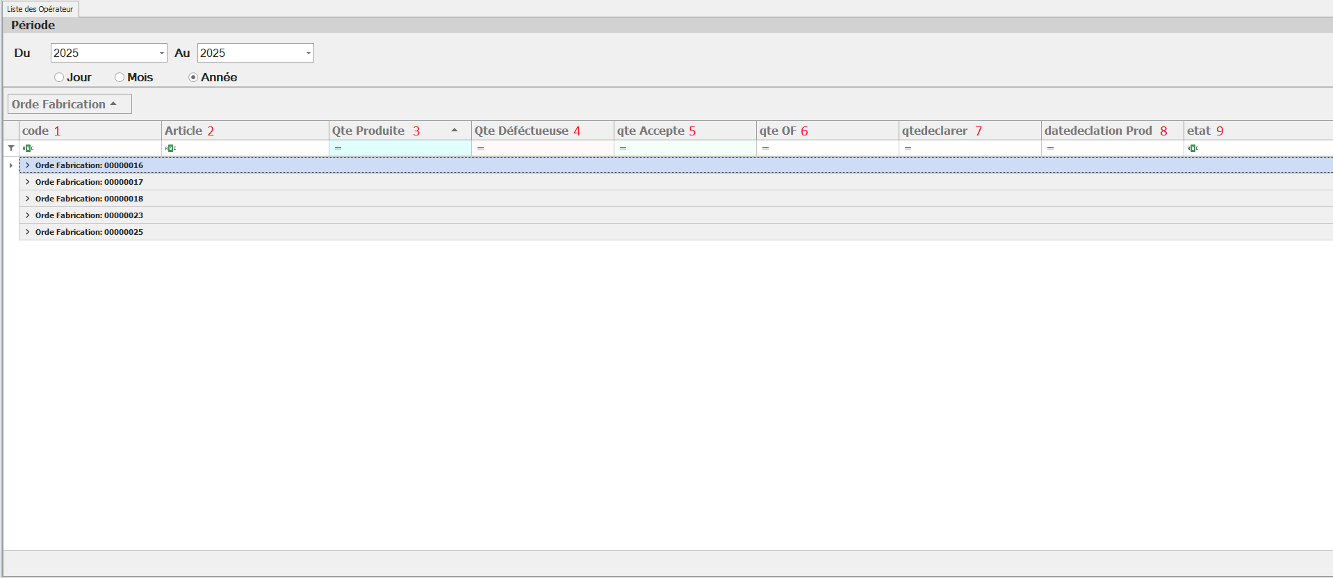 Quantité déjà déclarée jusqu’à la date courante sur l’OF, incluant la déclaration actuelle. Permet de suivre l’évolution progressive de la production.