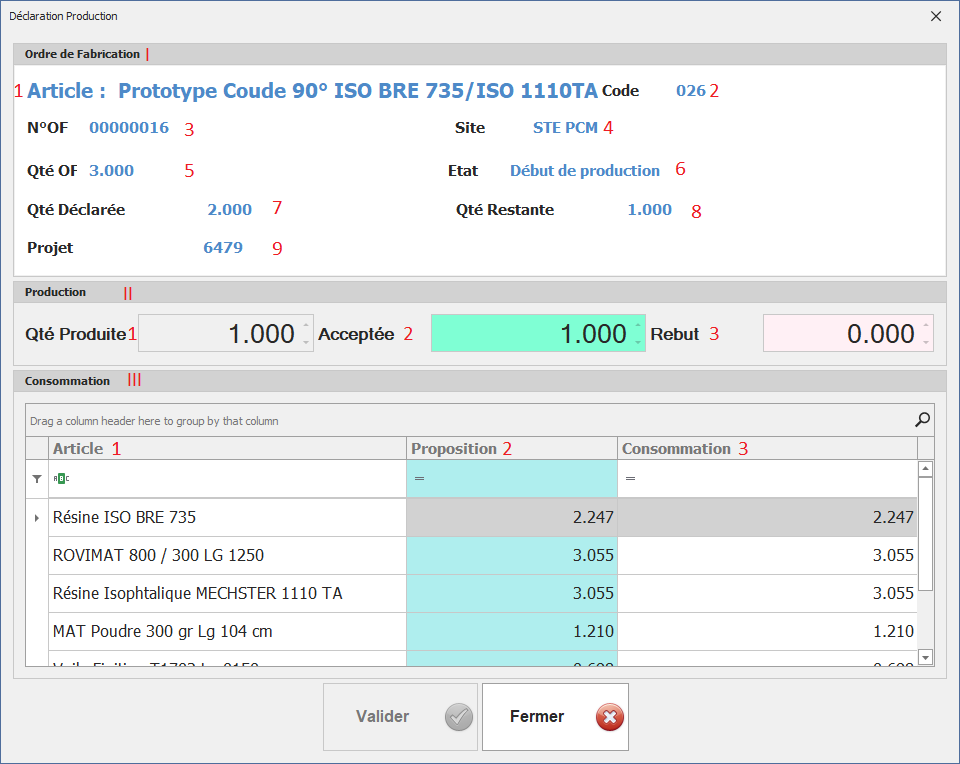 Cette interface sert à gérer et déclarer la production liée à un ordre de fabrication (OF). Elle permet de suivre la quantité produite, d’indiquer les quantités acceptées et les rebuts, et de visualiser la consommation des articles nécessaires à la production