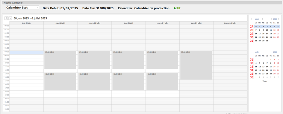 Cette interface permet de visualiser et de configurer la répartition des horaires de travail pour un modèle de calendrier spécifique, sur une période donnée. Elle propose une représentation hebdomadaire des séances de production, avec des horaires précis, facilitant ainsi la planification opérationnelle des équipes.