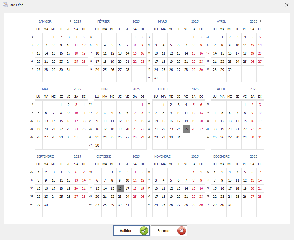 Cette interface permet de sélectionner un ou plusieurs jours fériés.