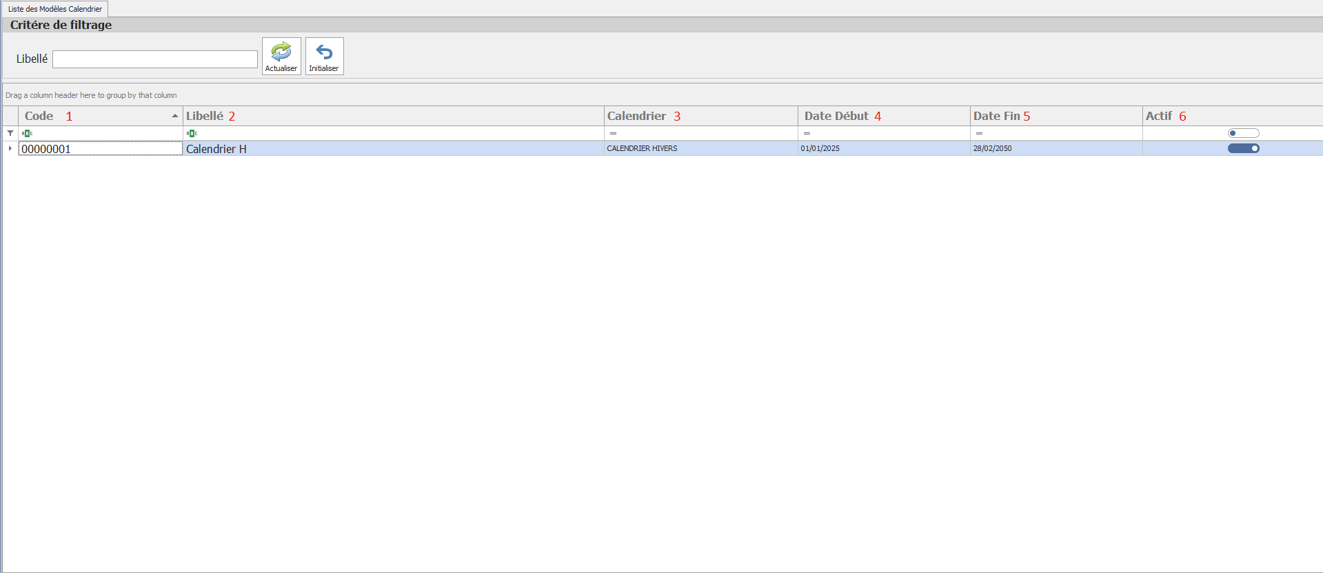 Cette interface permet de consulter, filtrer et gérer les modèles de calendrier existants. Elle offre une vue centralisée des différents modèles associés aux calendriers de production sur des périodes définies.