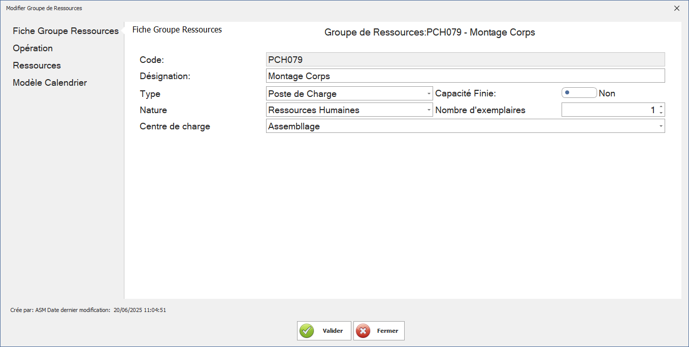 L’interface « Ressource » permet de gérer les ressources individuelles (machines, opérateurs, postes, outils, etc.) associées à un groupe de ressources.