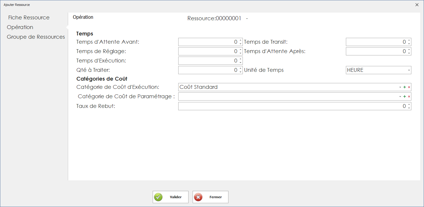 L’interface « Opération » permet de paramétrer les temps, les quantités à traiter, les catégories de coûts et le taux de rebut associés à une ressource dans une opération de production.