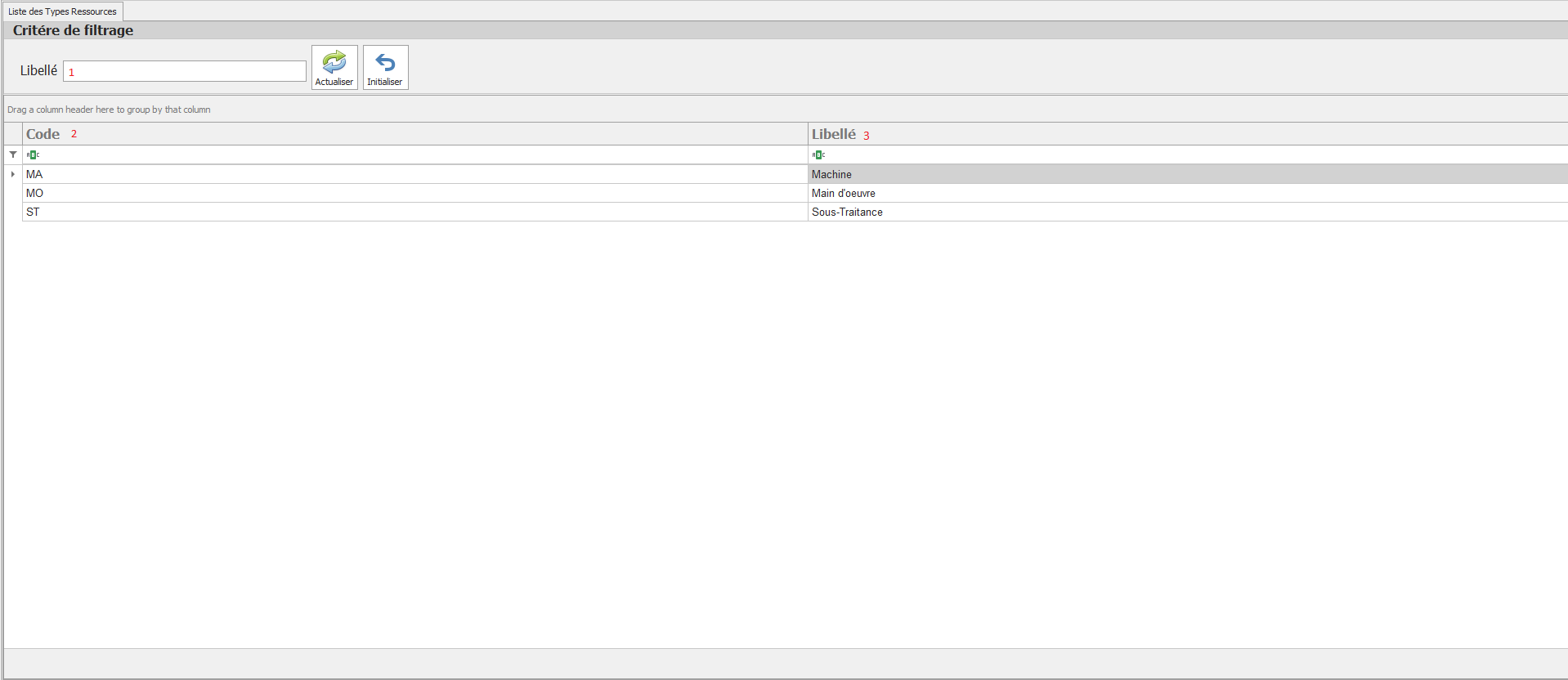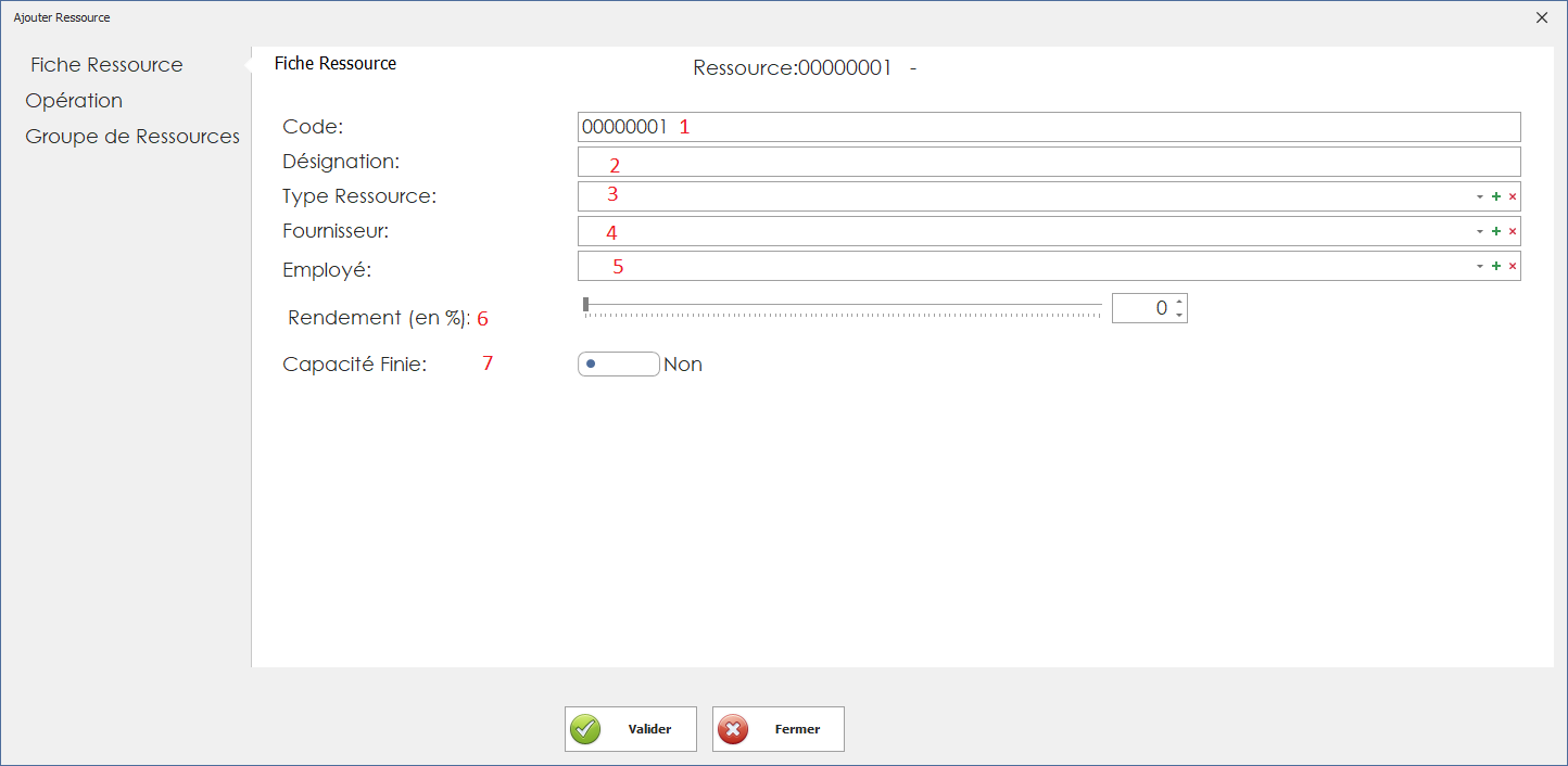 L’interface « Ressource » permet de gérer les ressources individuelles (machines, opérateurs, postes, outils, etc.) associées à un groupe de ressources.