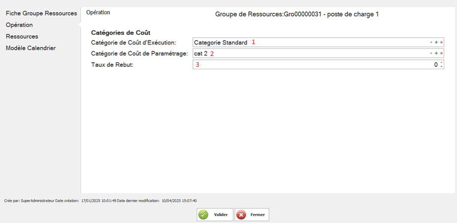 Catégorie de coût de paramétrage : Ce champ est utilisé pour affecter les coûts liés au réglage ou à la préparation de l’opération (ex. : réglage d’une machine, test avant production).