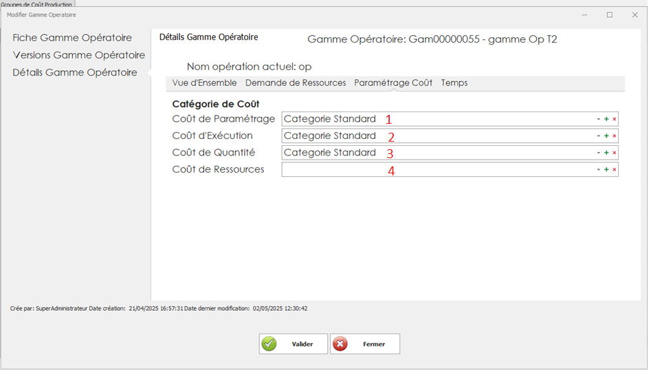 Cette section permet de définir les différentes composantes du coût liées à une opération dans une gamme opératoire.