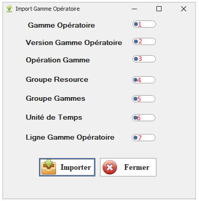 L’interface Import Gamme Opératoire permet d’importer et de paramétrer les éléments constitutifs d’une gamme opératoire dans le système.