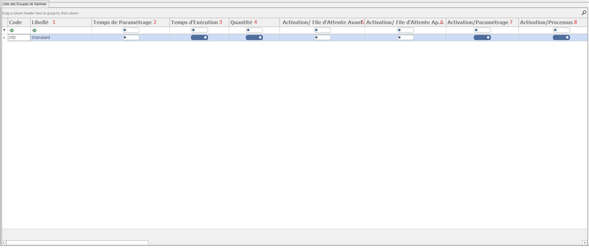 Définition : Indique si l’opération fait partie d’un groupe de gammes standardisées ou partagées entre plusieurs articles.