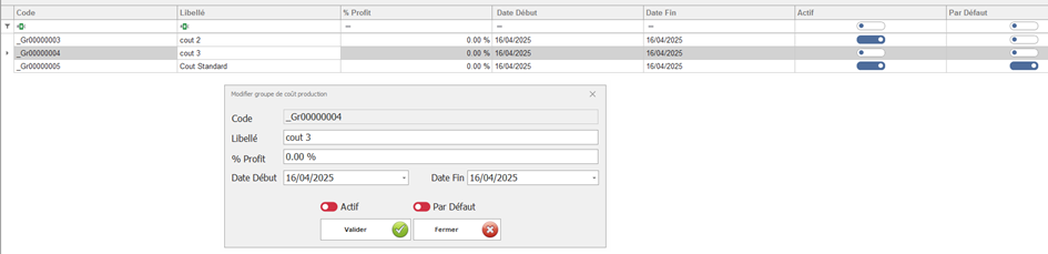 Cette interface permet de créer des groupes de coûts et d’en afficher la liste
