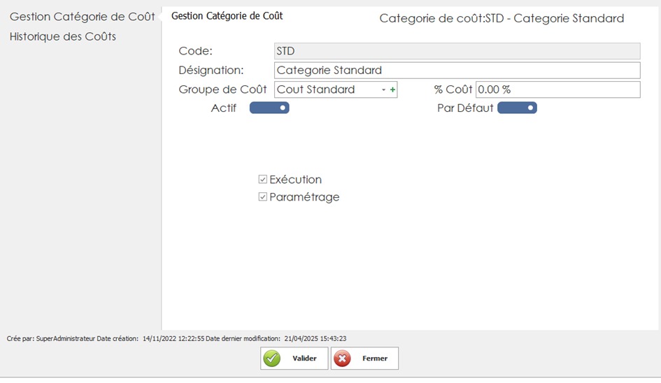 ·  Paramétrage (case à cocher) : permet d’activer ou désactiver le paramétrage des coûts pour cette catégorie.
