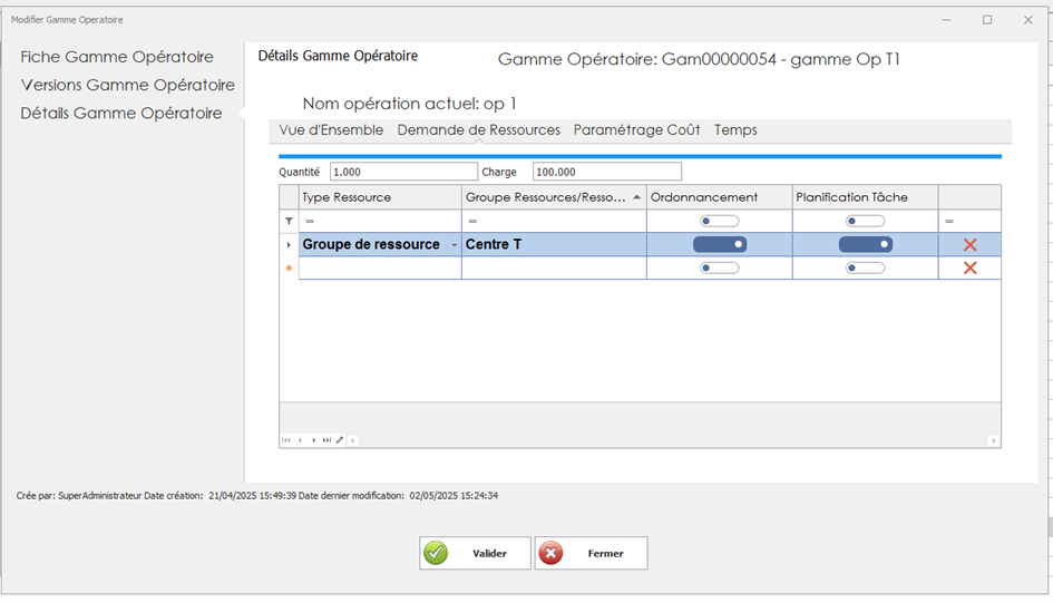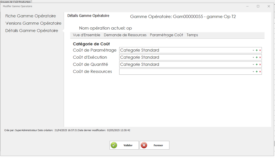 Ce module permet également de renseigner les coûts liés à chaque opération, ce qui facilite l’estimation du coût global de fabrication. La gamme opératoire constitue ainsi un élément essentiel pour la planification, l’ordonnancement et le suivi précis de la production.