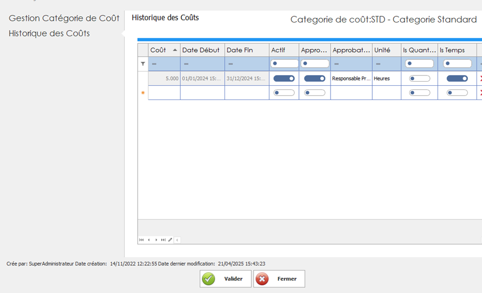 • Action (colonne vide avec croix rouge) : Permet de supprimer une ligne de coût de l’historique.