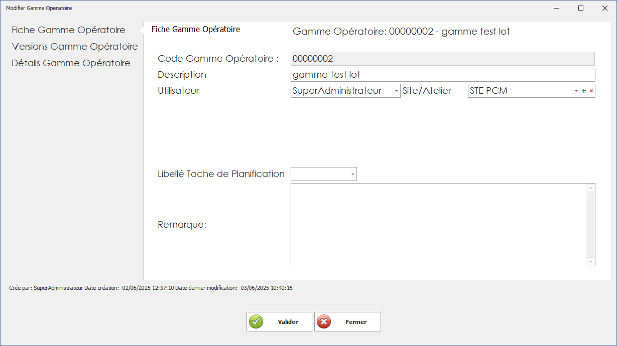 2: Version de Gamme : lie la gamme à un produit fini avec période de validité.