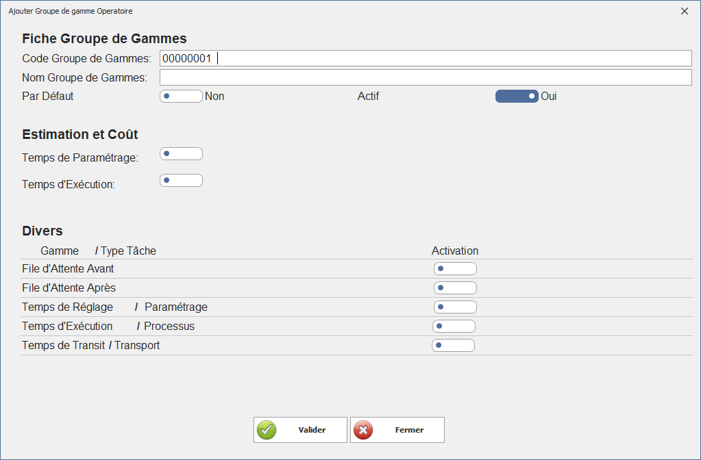 Groupe de Gammes : Indique si l’opération appartient à un groupe de gammes standardisées ou partagées entre plusieurs articles.