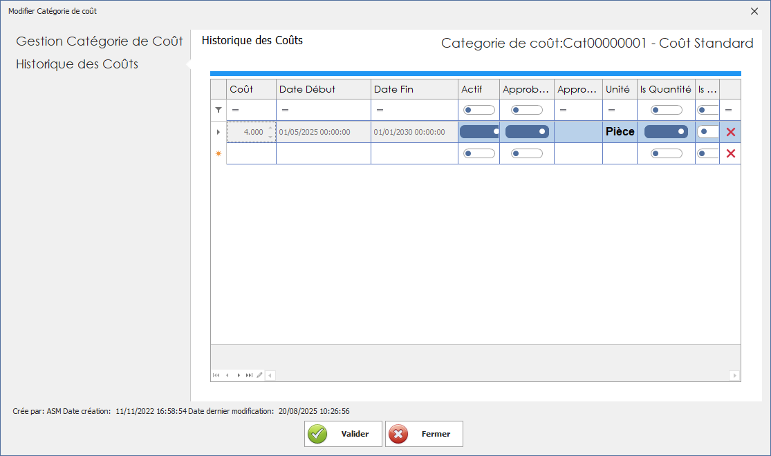 • Date Début : Date de début de validité du coût saisi. À partir de cette date, le coût entre en application.