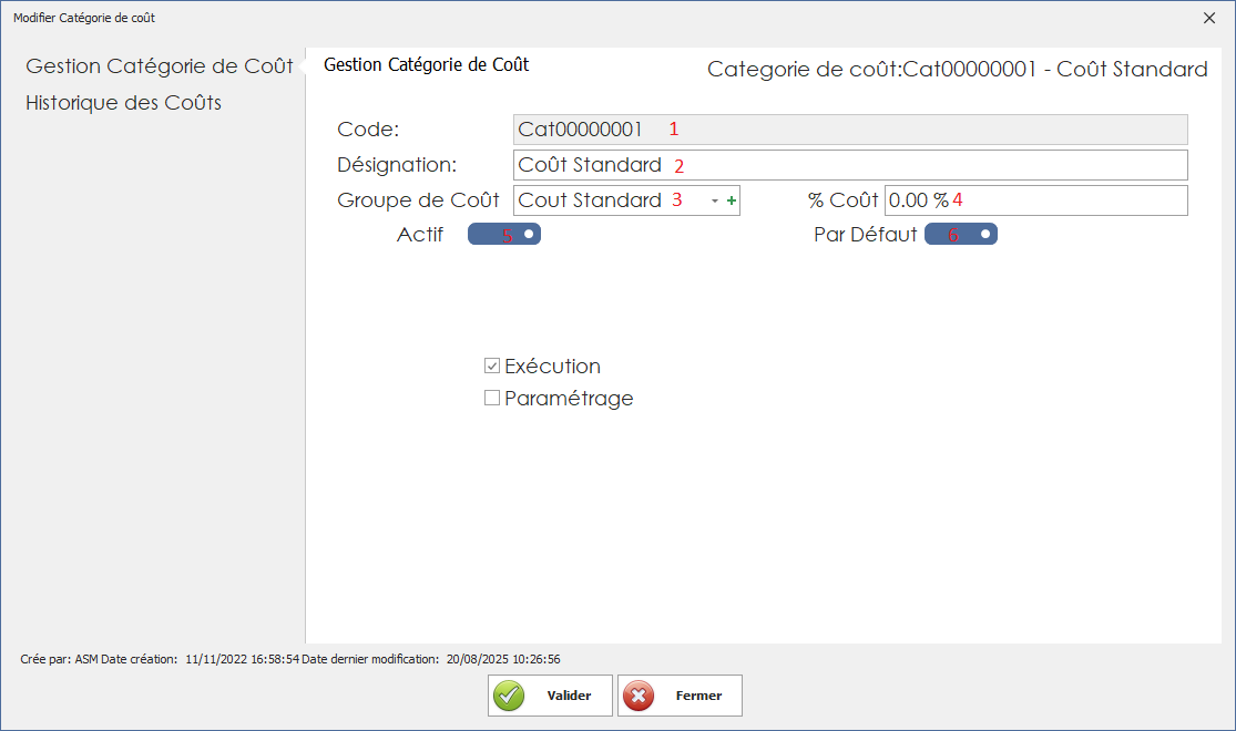 Date Fin : Date de fin d’application du coût. Cela permet de gérer des périodes successives avec des valeurs différentes.
