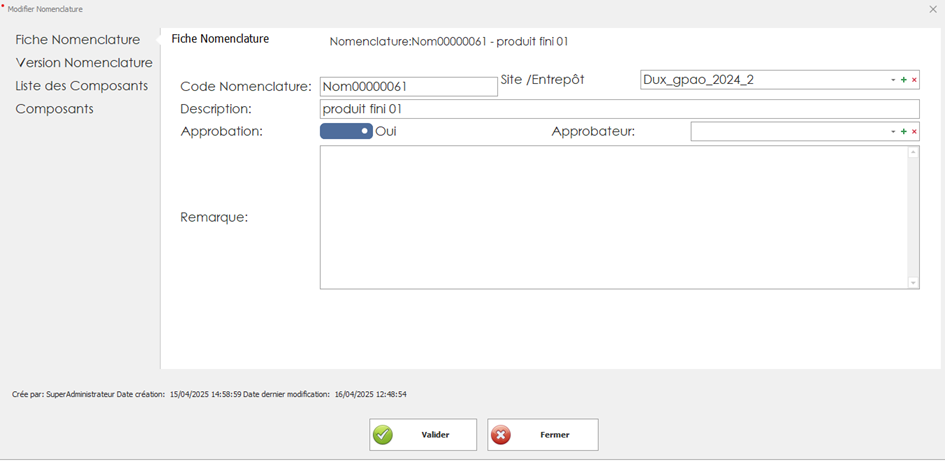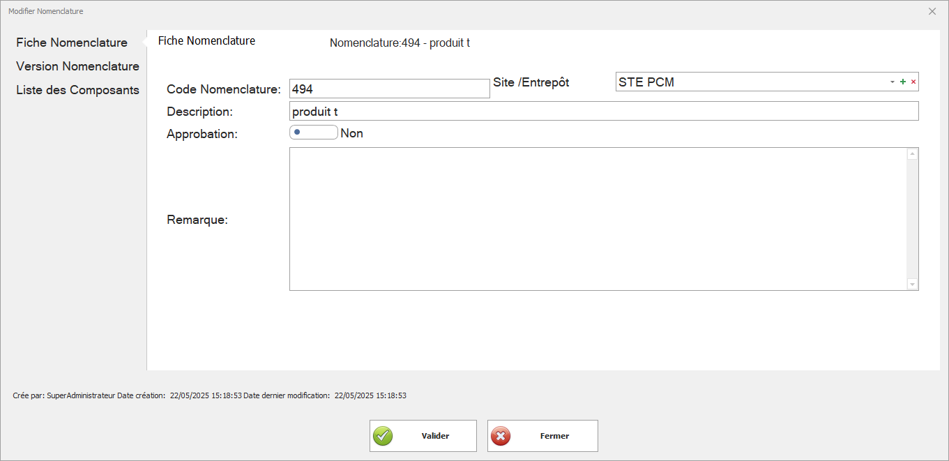 Lors de l’ouverture de l'interface fiche nomenclature , l’utilisateur accède aux champs principaux définissant l’identité de la nomenclature. Ces champs permettent de créer ou de modifier une fiche de manière structurée avant d’ajouter les versions et les composants. Voici une description détaillée des éléments affichés à cette étape :