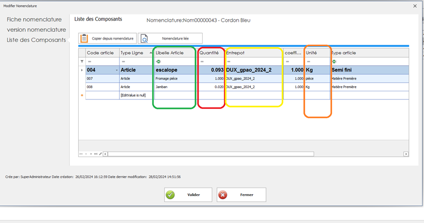 Cette interface permet de mettre à jour la nomenclature (ou BOM - Bill of Materials) liée à un article, en modifiant les quantités ou les désignations des composants utilisés dans sa fabrication.