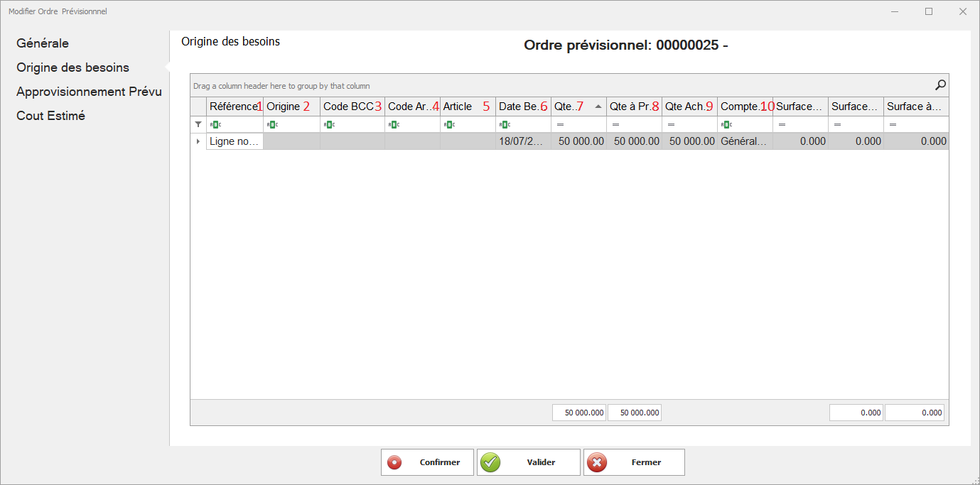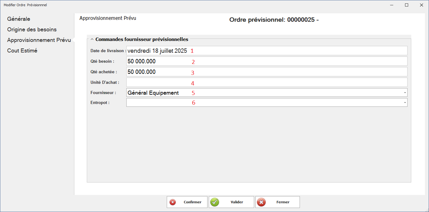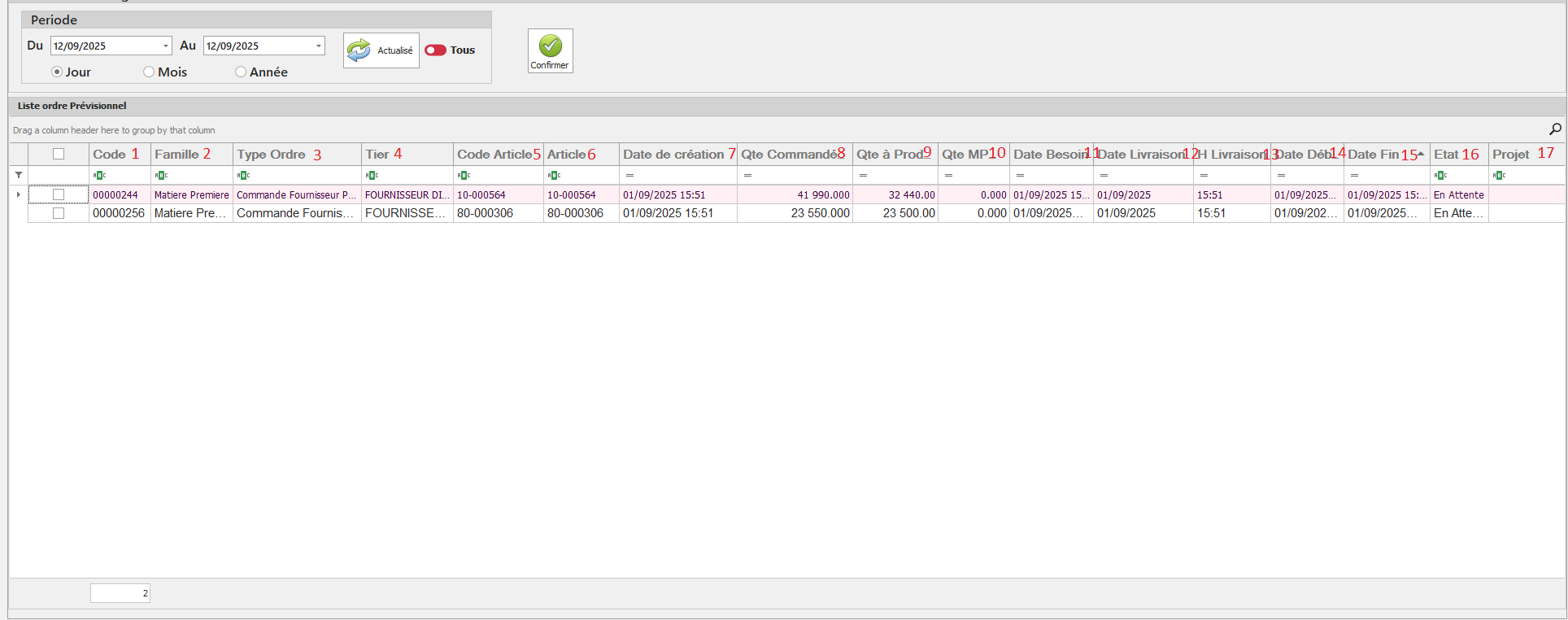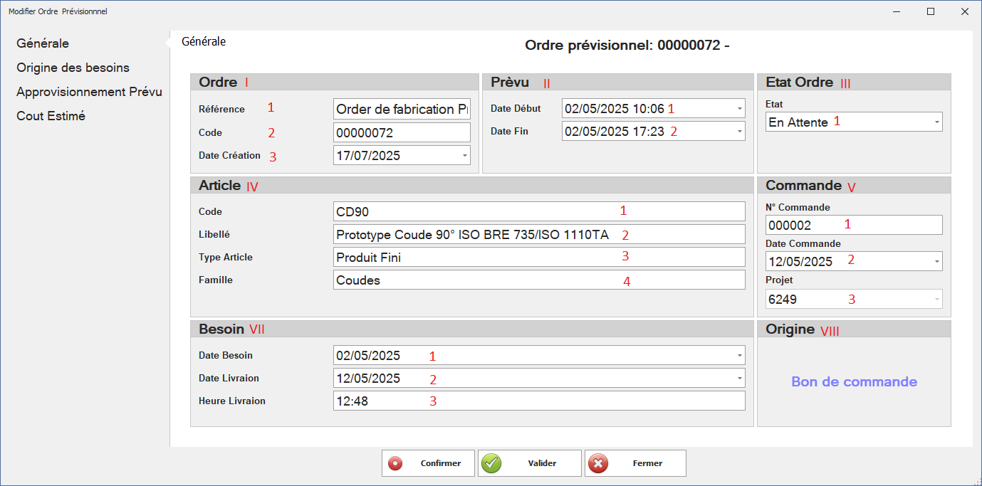 1: État : Statut actuel de l’ordre prévisionnel (ex. : En attente, Validé, Terminé, etc.).
