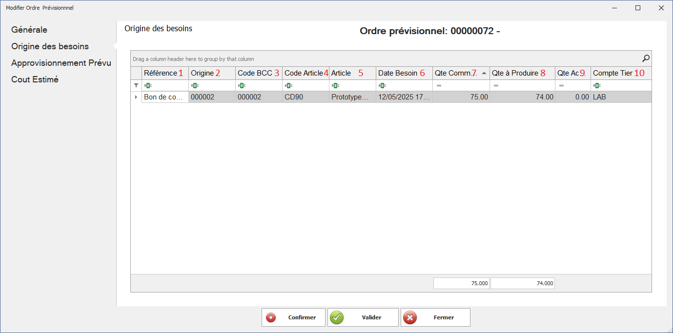 8: Qté à Produire : Quantité à produire dans le cadre de l’ordre prévisionnel pour répondre au besoin.