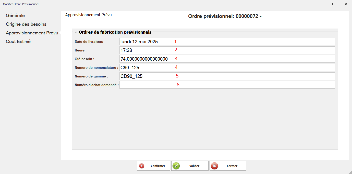 L’interface « Approvisionnement Prévu » est destinée à la planification des besoins en production dans le cadre d’un ordre de fabrication prévisionnel. Elle permet de préciser les détails liés à la livraison prévue, à la nomenclature et à la gamme de fabrication, ainsi qu'à la quantité nécessaire. Cette étape est essentielle pour anticiper l’approvisionnement en composants ou matières premières et organiser efficacement la production.