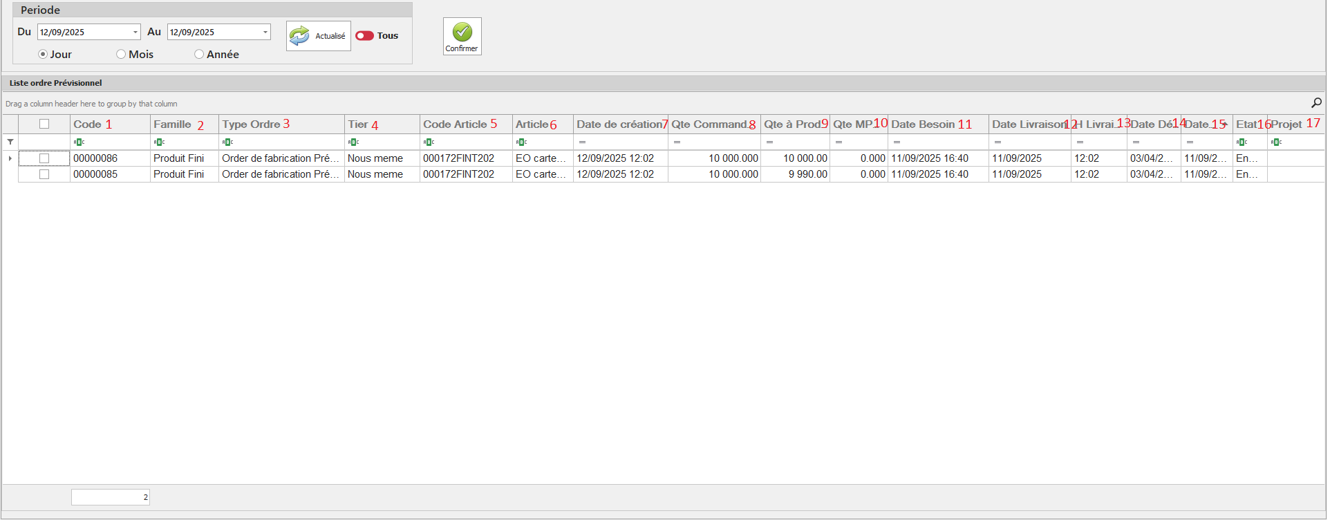 2: Date Fin : Date et heure prévues pour la fin de la fabrication.