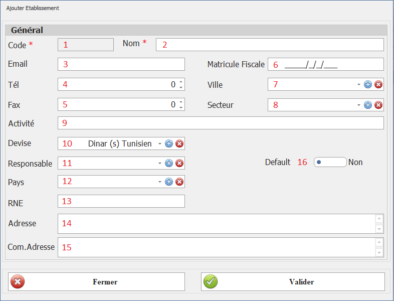 Utilisation : Un établissement unique par défaut afin d’assurer la cohérence des opérations.