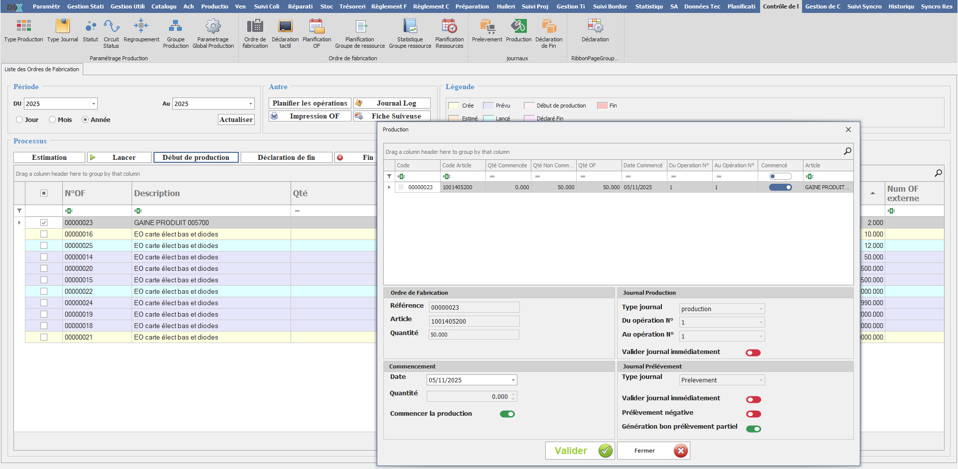 Cette interface de début production Montre les détails d'ordre de fabrication telque la quantité fabriquée et la date de commencement en plus les détails de journal production et prélèvement. En effet