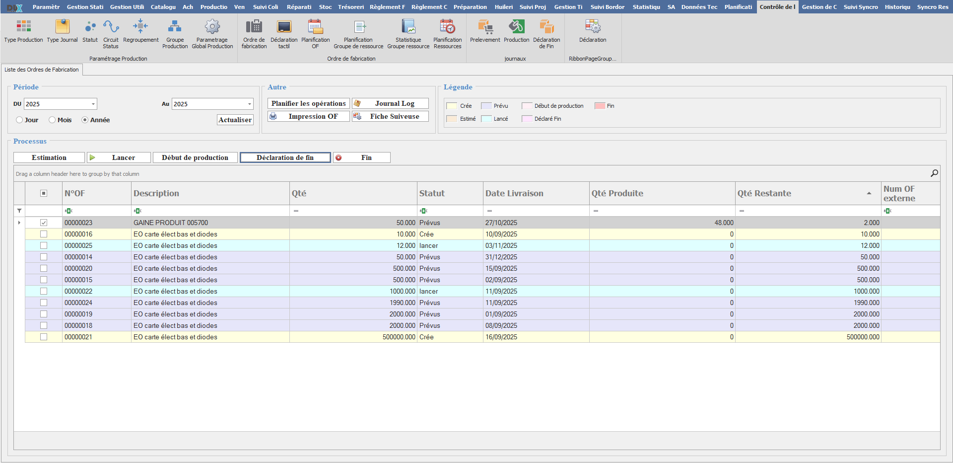 Cette interface de début production Montre les détails d'ordre de fabrication telque la quantité fabriquée et la date de commencement en plus les détails de journal production et prélèvement. En effet