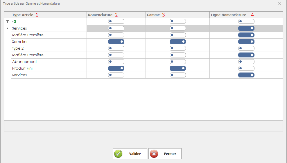 Activer ou désactiver certaines lignes de gamme ou de nomenclature selon le type d’article.