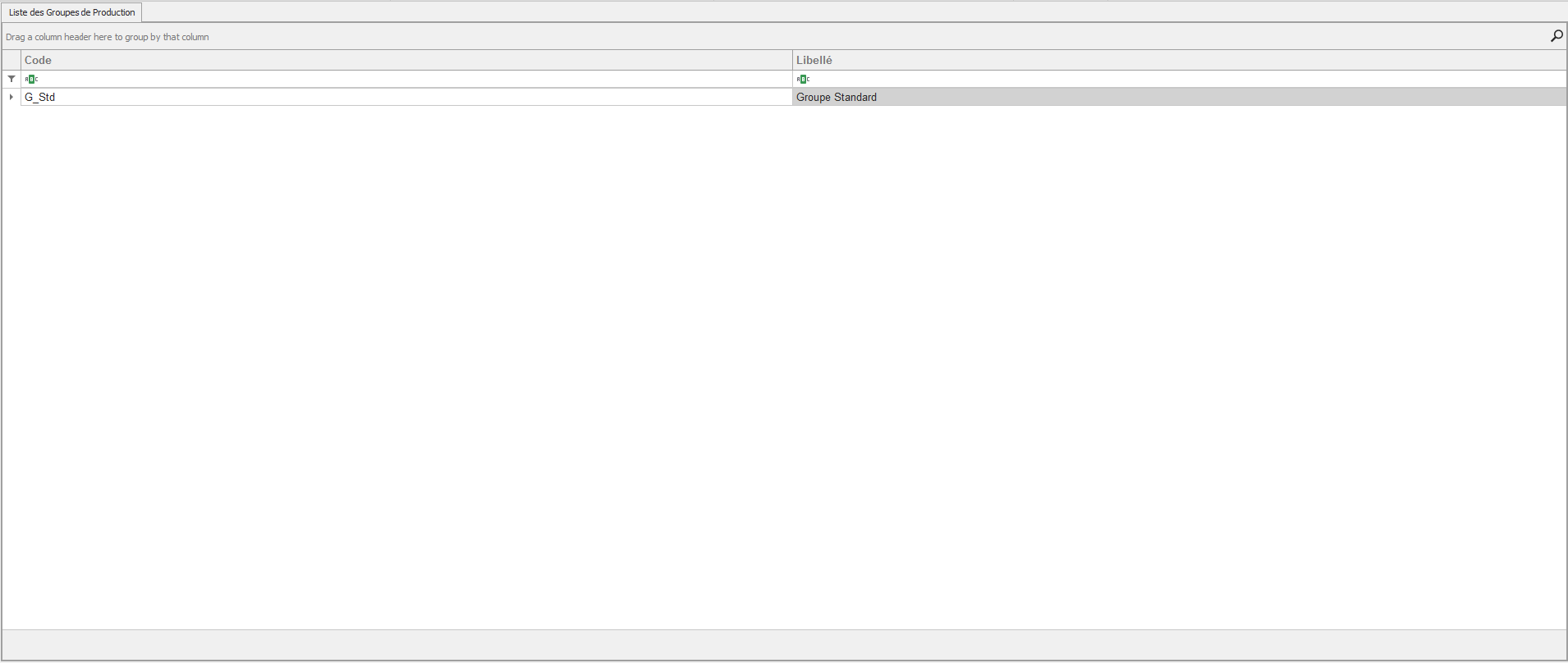 Cette interface présente la liste des groupes de production définis dans le système. Les groupes de production permettent de classer ou regrouper différents types de production selon des critères organisationnels ou techniques (ex. : type de produit, ligne de production, processus commun, etc.).