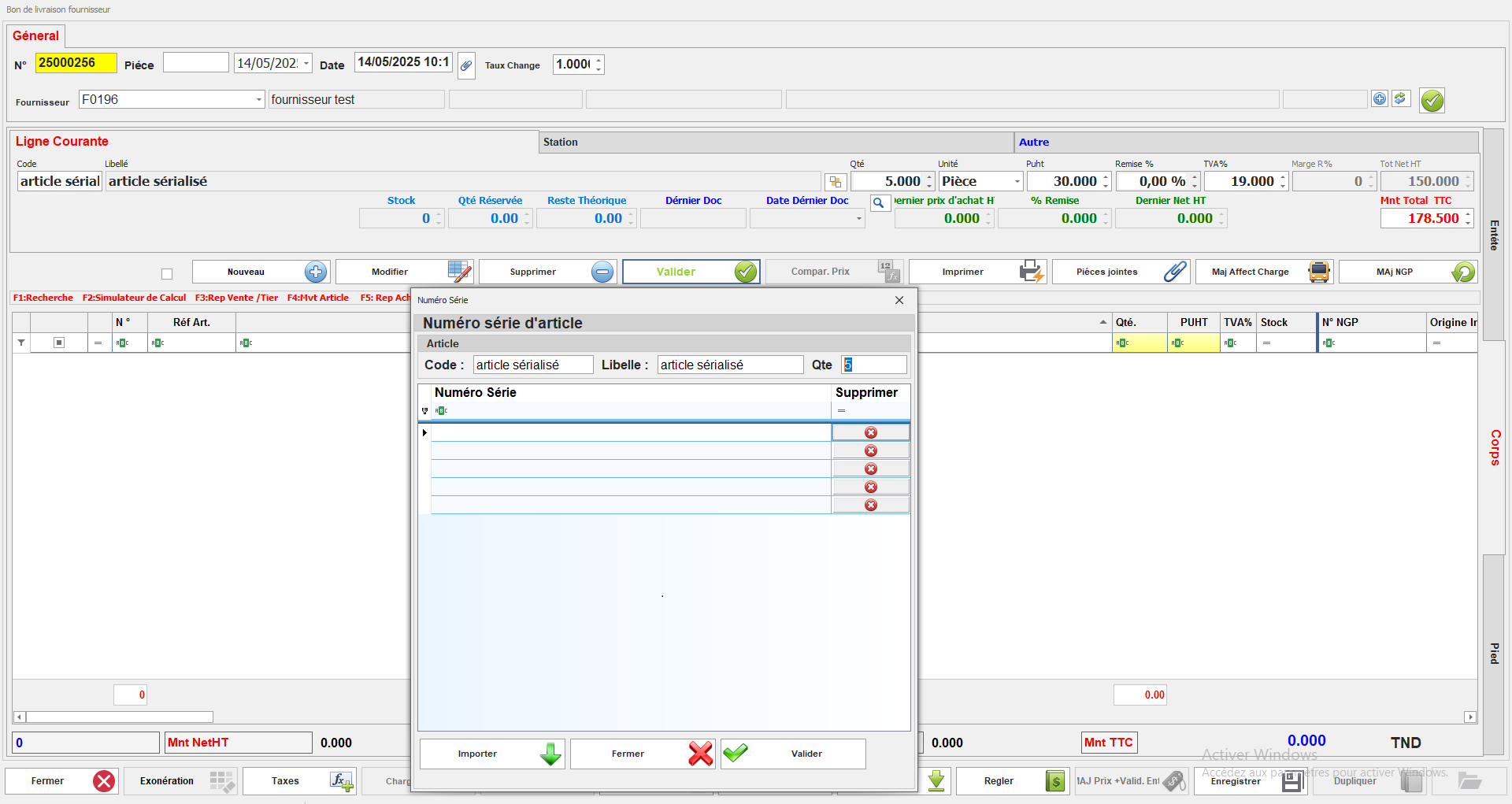 1. Pop-in Choix des numéros de série après sélection de l’article et saisir sa quantité et  prix .