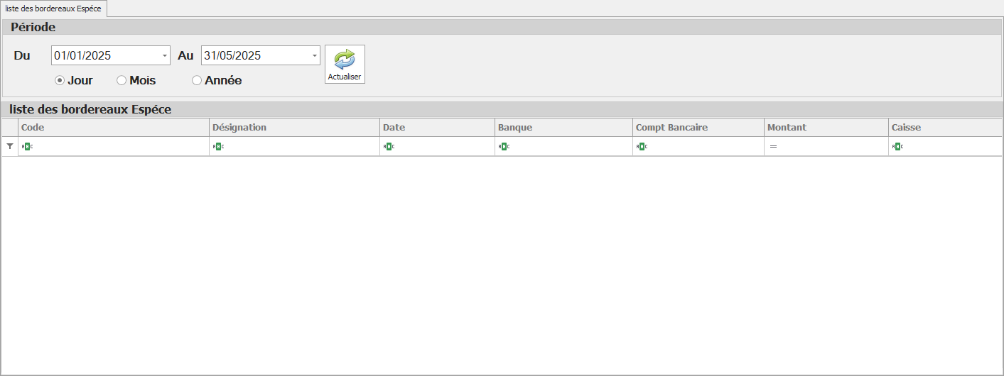 L’interface se présente sous la forme d’un tableau synthétique listant l’ensemble des bordereaux d’espèces générés. L’utilisateur a la possibilité d’effectuer un filtrage par date, permettant de restreindre l’affichage à une période donnée (par exemple, les versements de la semaine, du mois ou d’un exercice comptable).