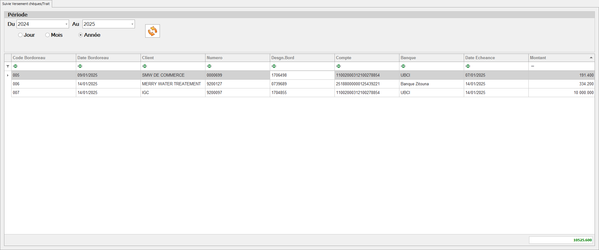 La fonctionnalité Suivi Versement Chèque/Traite est un outil de contrôle et de traçabilité indispensable dans la gestion de la trésorerie. Elle permet d’assurer un suivi rigoureux des remises de chèques et de traites auprès des établissements bancaires, tout en facilitant l’analyse et la vérification des encaissements à terme. Grâce à cette interface, l’utilisateur peut visualiser, filtrer et contrôler toutes les informations relatives aux bordereaux de remise de chèques ou traites, assurant ainsi une parfaite transparence et une gestion fiable des flux financiers différés.