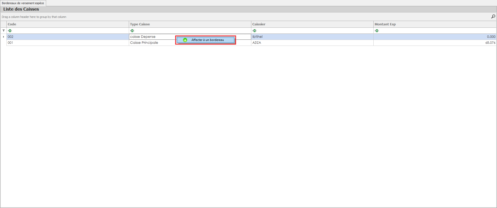 Cette action déclenche l’ouverture de l’interface Affectation Versement Espèce, qui permet de créer une opération de versement ou d’ajouter la caisse sélectionnée à un bordereau déjà en cours de préparation.