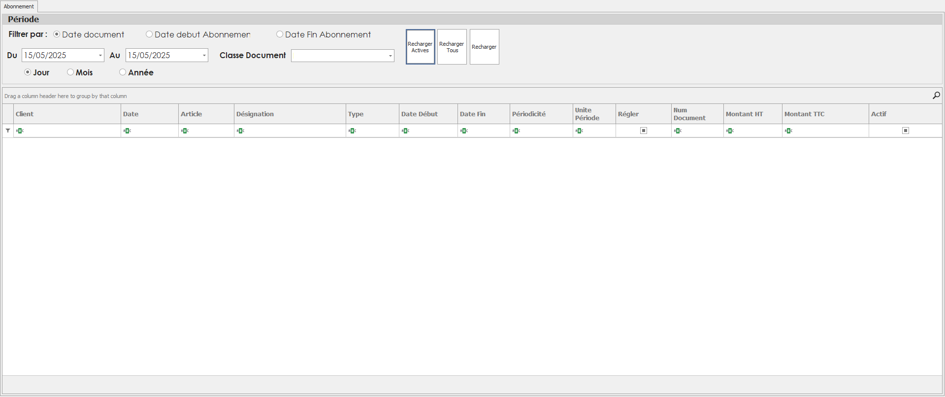 3. La fenêtre des abonnements s’ouvre avec, en tête, les zones de filtrage et de commande.