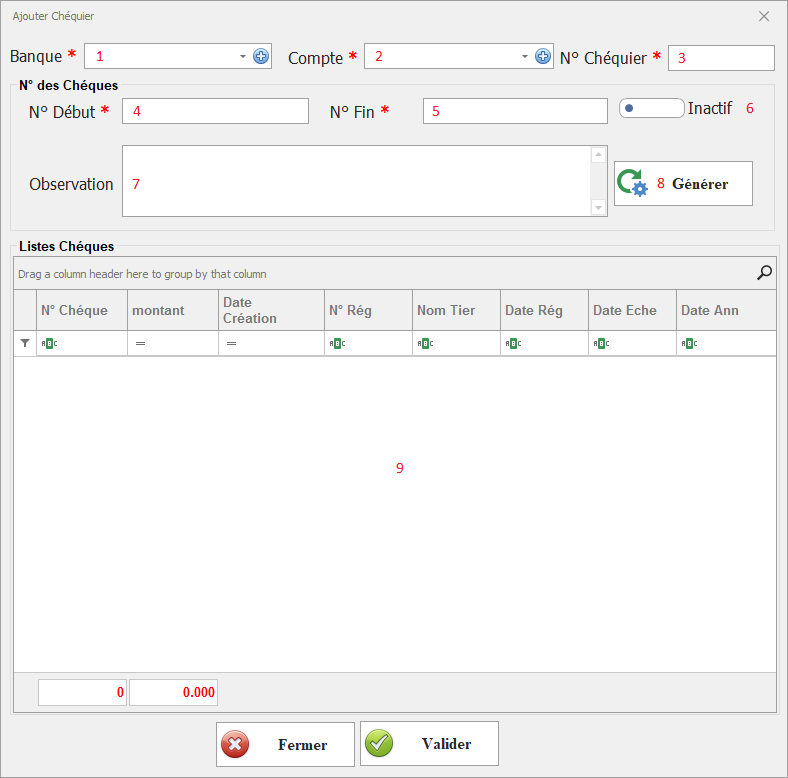 N° Fin : Dernier numéro de chèque dans le chéquier.