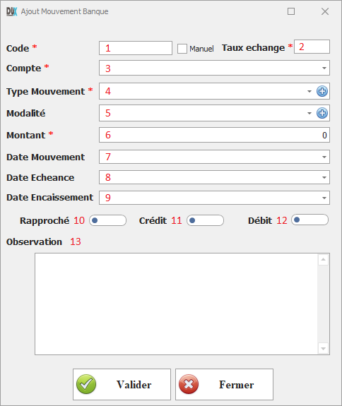 | Type Mouvement | Nature du mouvement (ex : virement, chèque, traite, etc.). |