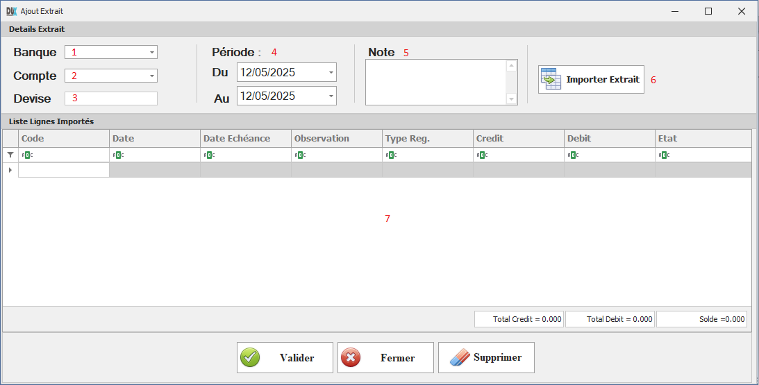 Extrait : sélection d’un extrait bancaire préalablement importé.