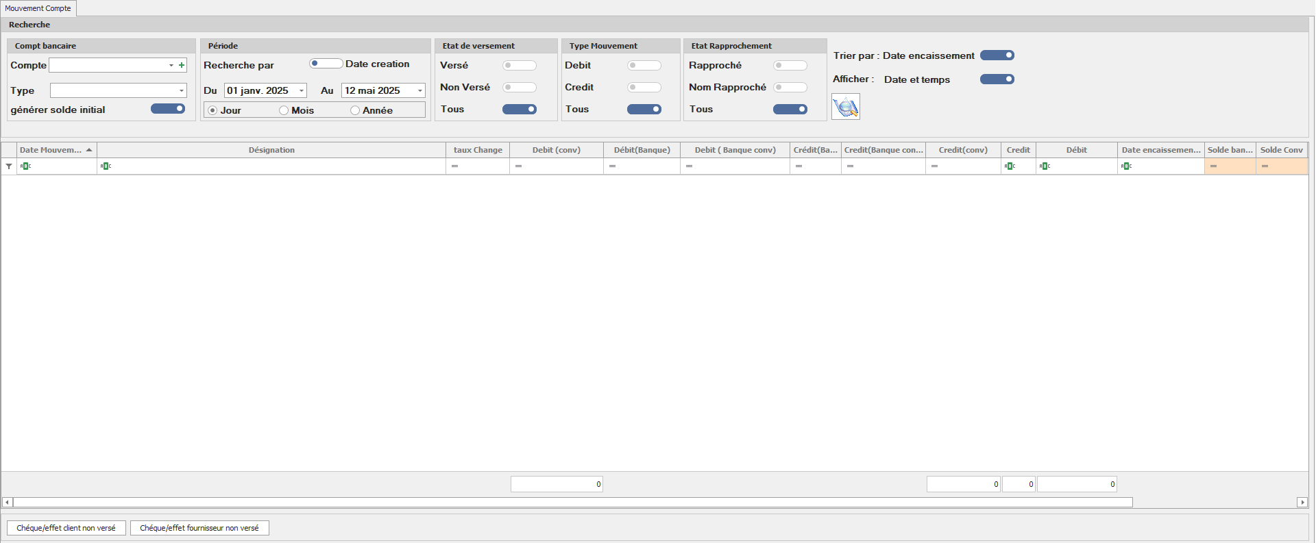 Un filtre par banque, compte ou date peut être appliqué pour faciliter la recherche.