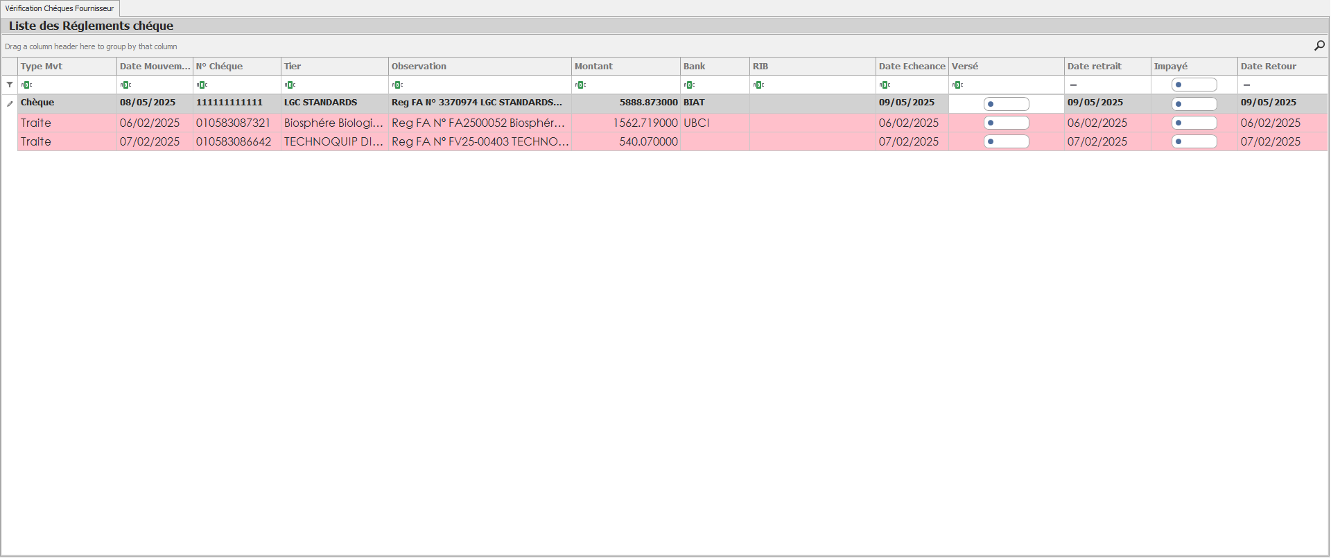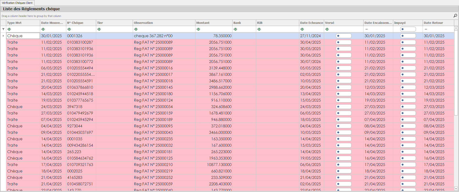 La fonctionnalité Vérification Versement Chèque Client permet de consulter, filtrer et mettre à jour l’état des chèques clients reçus, notamment pour suivre leur état de versement, d’encaissement ou de rejet (impayé).