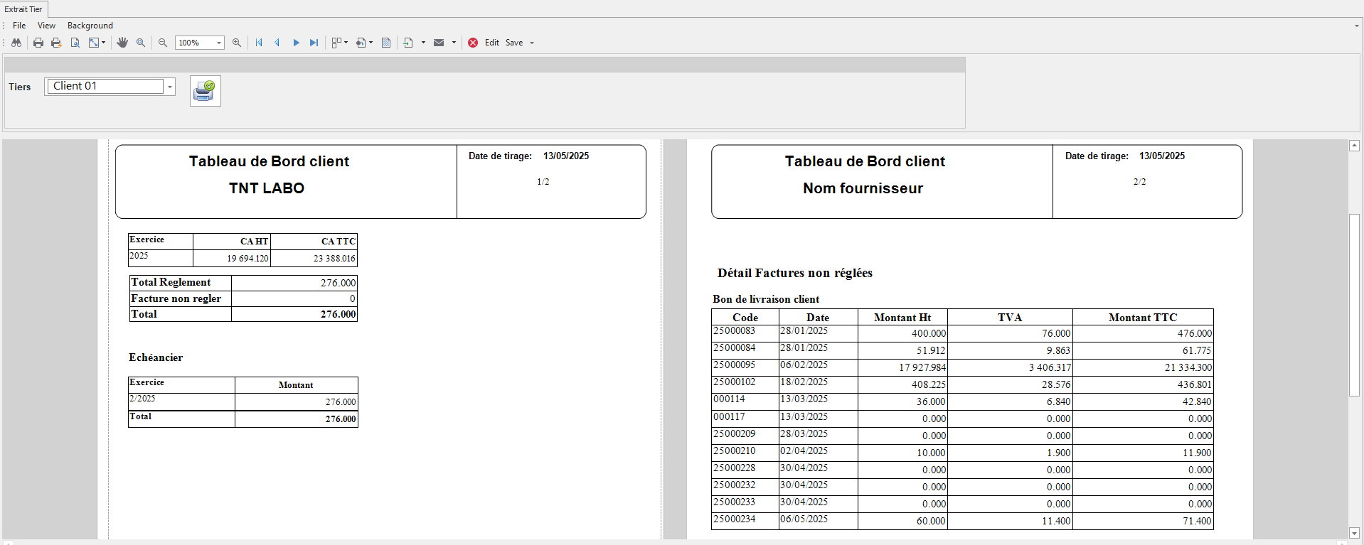 Le Tableau de Bord Client offre une vue synthétique et interactive des principaux indicateurs financiers et commerciaux liés à un client sélectionné. Grâce à un jeu de filtres en amont, l’utilisateur peut choisir le client (« tiers »)  puis visualiser dans l'exercice en cour :